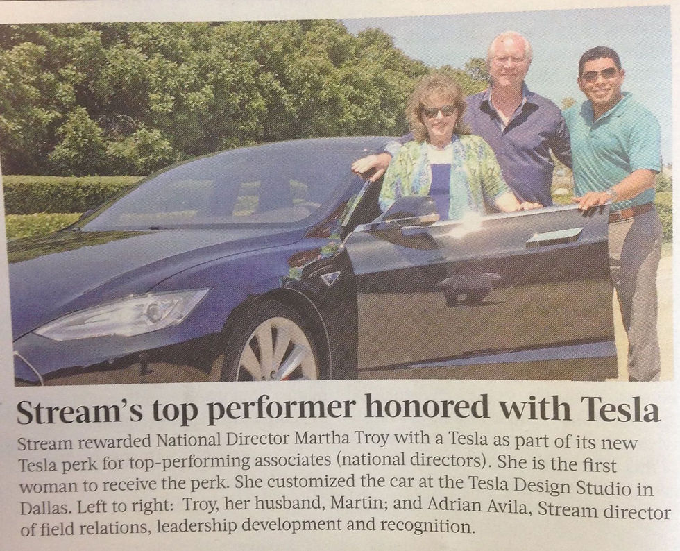 Martha "Mom" Troy is the latest recipient of the sleek new Tesla Model S, becoming the 11th National Director and the #18 Income Earner at Stream Energy.